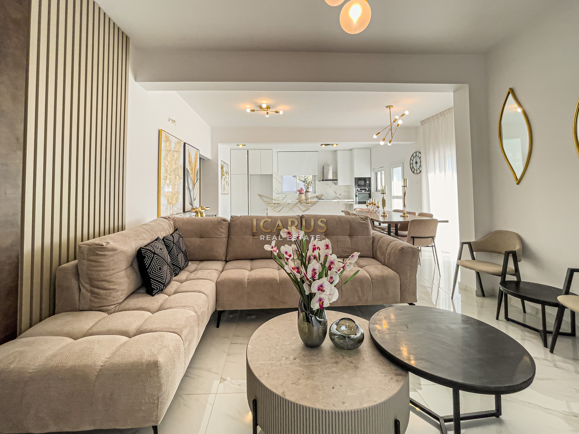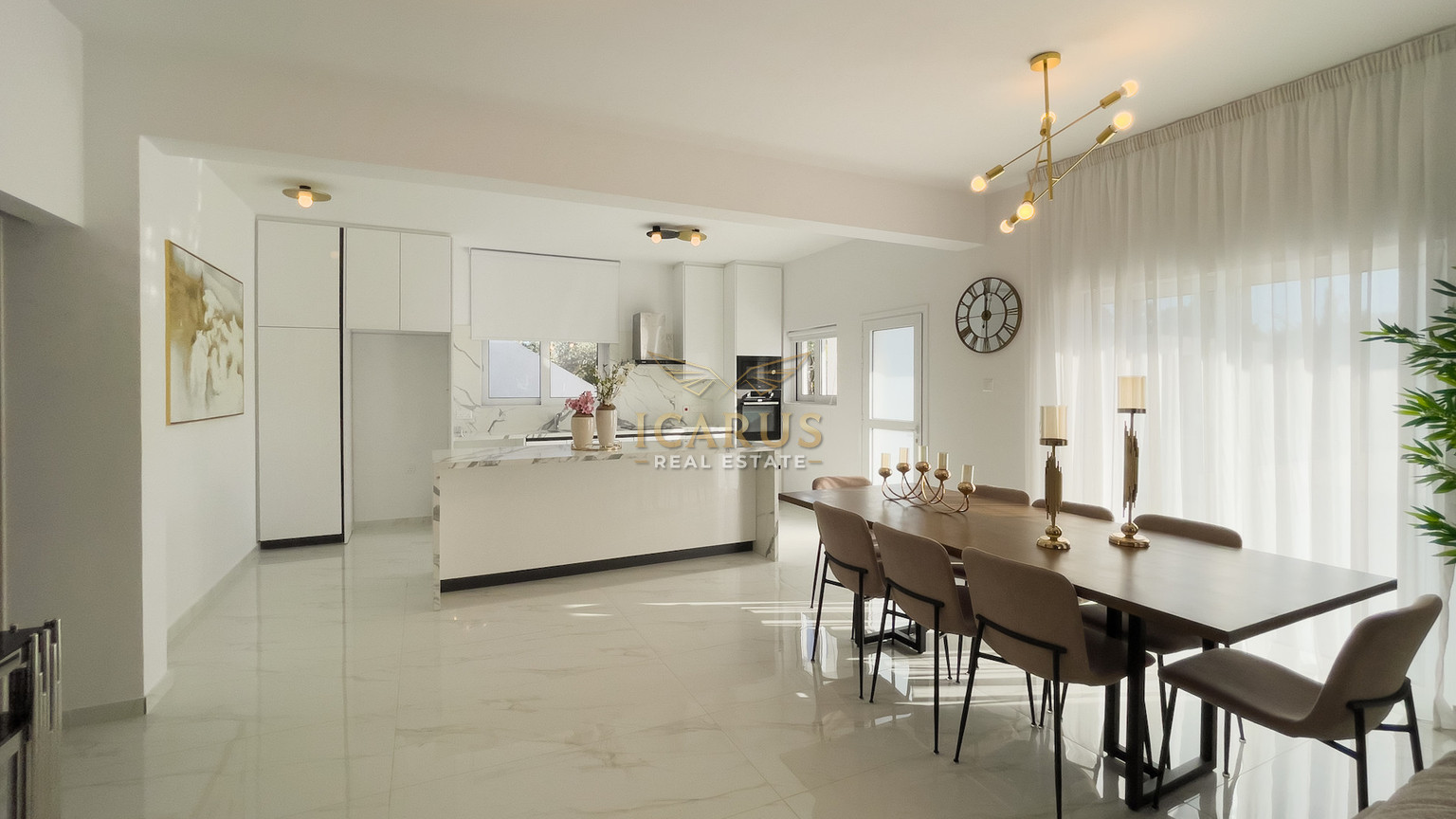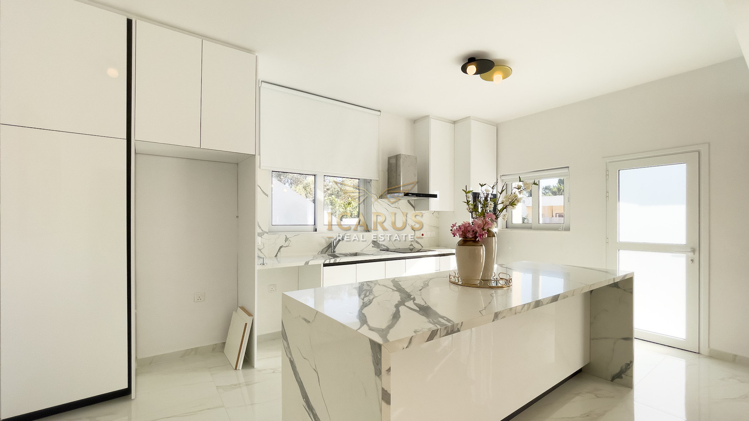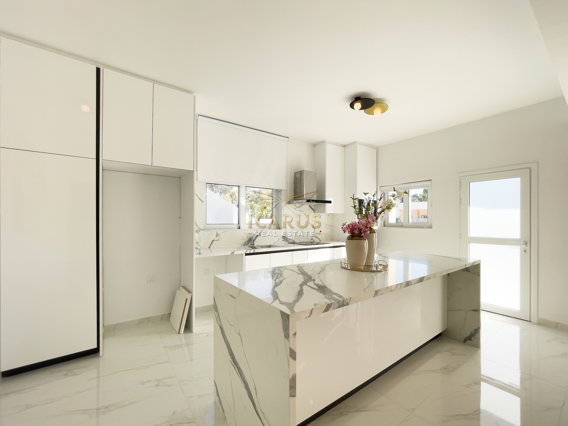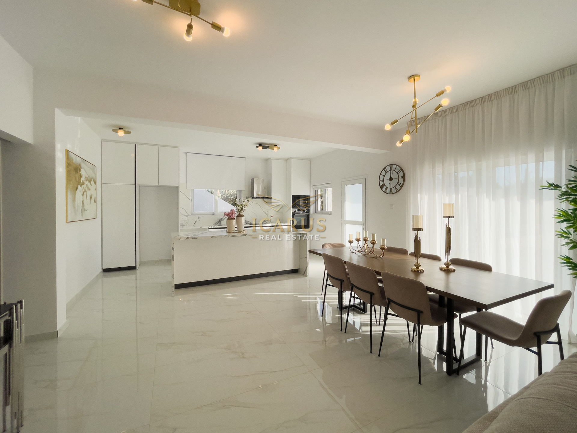 This beautifully designed ground floor house offers comfort, space, and modern living just minutes from the heart of Paralimni. Featuring an open-plan layout, it includes a spacious living area, a modern kitchen with an island and ample counter space, and a dining area perfect for family gatherings.