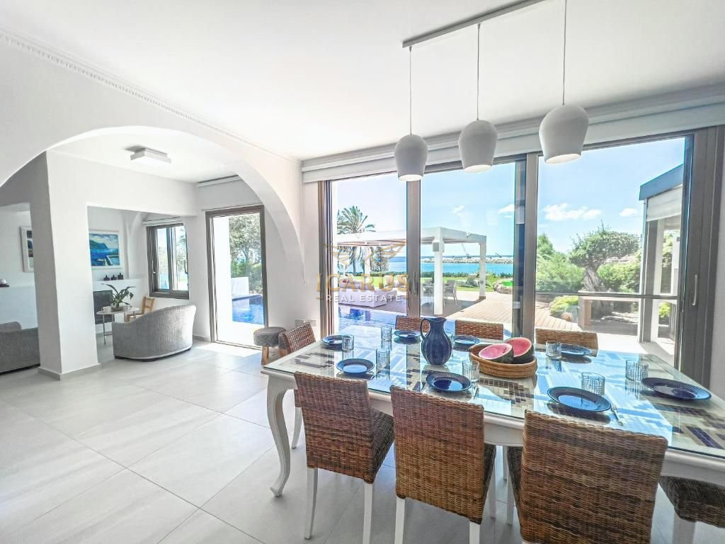 The villa's exterior is equally impressive, with a spectacular overflow swimming pool, where you will enjoy endless views of the azure sea. A large covered veranda provides the perfect spot for alfresco dining or relaxing in the shade, while the extensive grassy area invites you to unwind and enjoy the gentle coastal breeze.