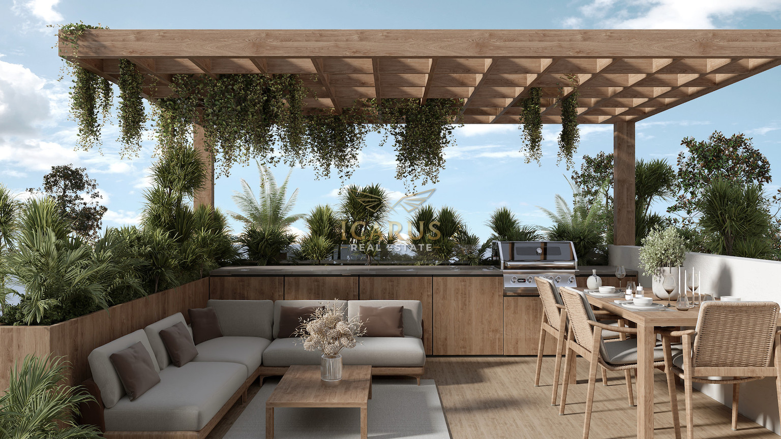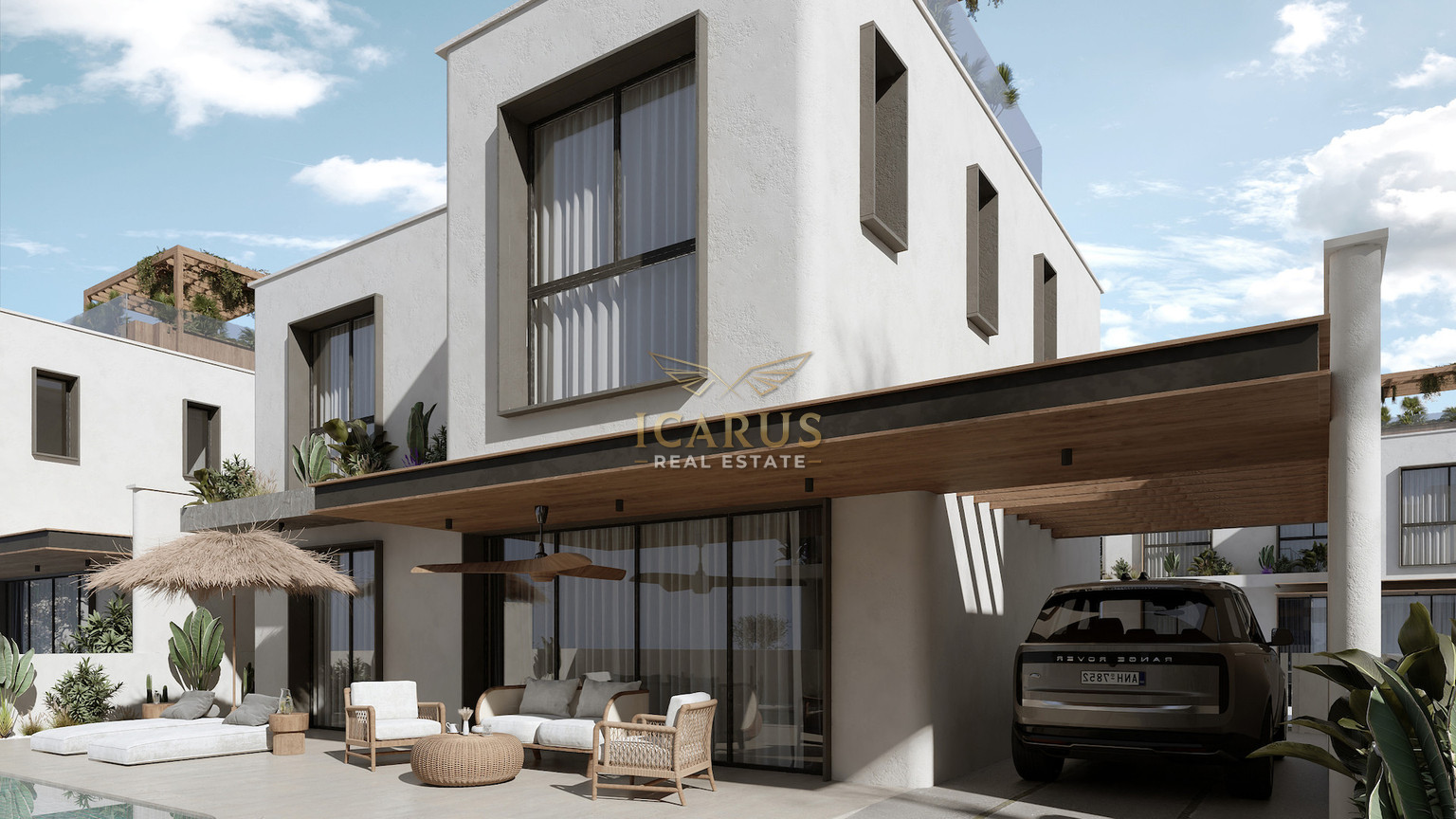 Upstairs, the villa offers three additional bedrooms, including a luxurious master suite with an en-suite shower, as well as a shared bathroom. A highlight of the property is the rooftop terrace, offering panoramic views of the sea and the surrounding landscape—perfect for enjoying Cyprus’s spectacular sunsets.