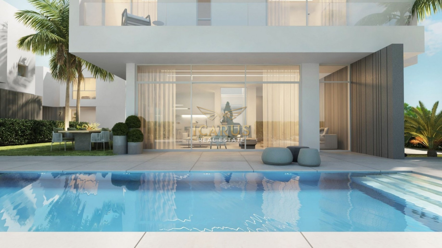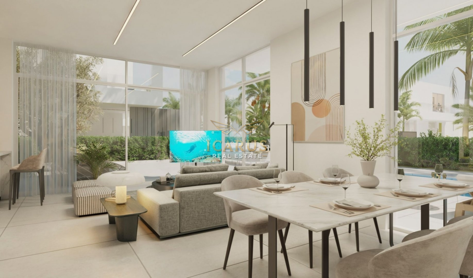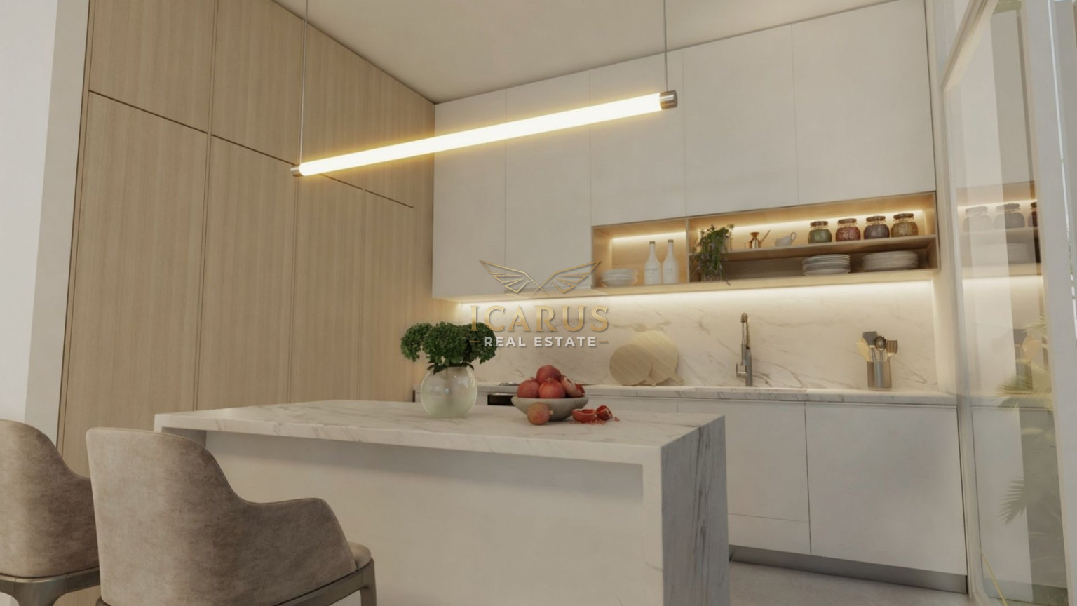 Step inside to a bright and airy open-plan layout where the sleek, modern kitchen with an elegant island seamlessly connects to a spacious living area and an inviting dining space. Expansive floor-to-ceiling sliding glass doors flood the home with natural light and create a serene, open atmosphere. A convenient guest WC completes the ground floor.