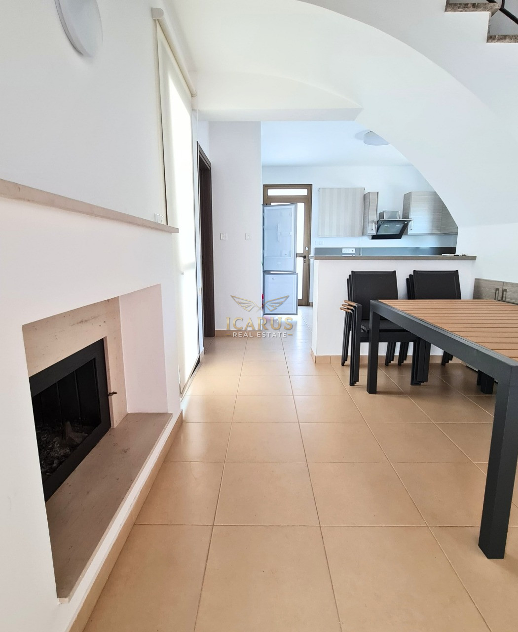 Set on a large plot, the villa is in excellent condition and furnished. The ground floor features a spacious living area with a cozy fireplace, a fully equipped kitchen with dining area, and one bedroom with bathroom. Upstairs, there are two more bedrooms, a bathroom, and a large balcony perfect for relaxing or enjoying the views.