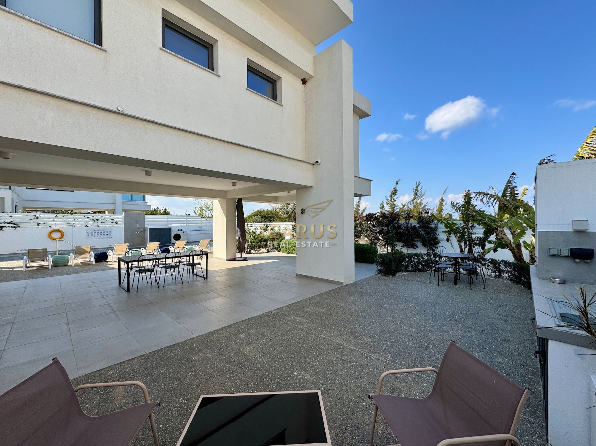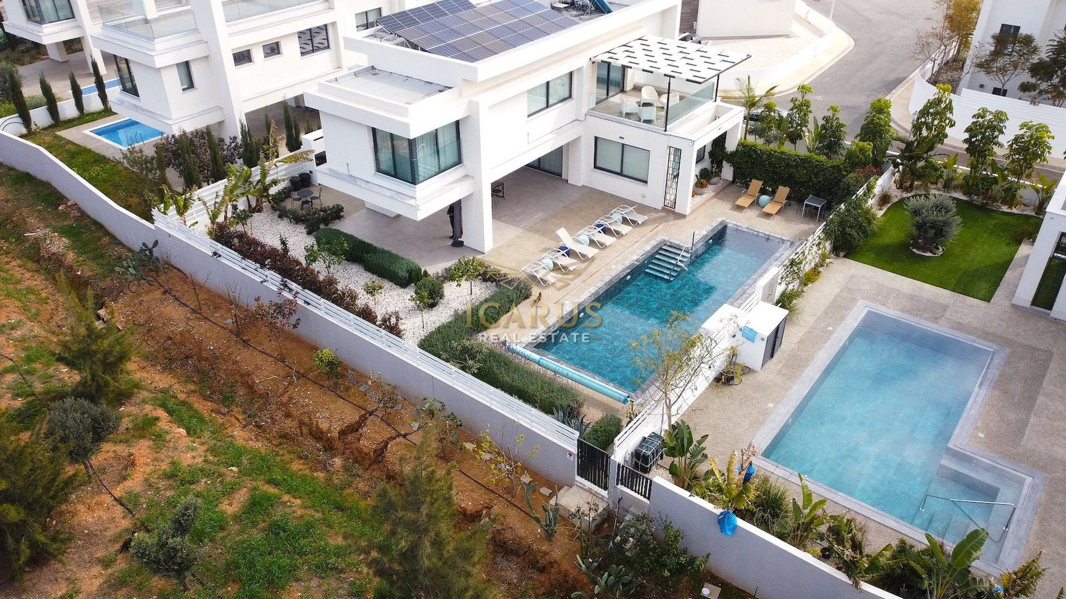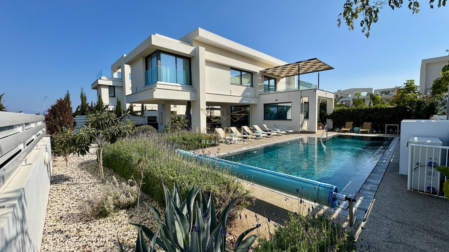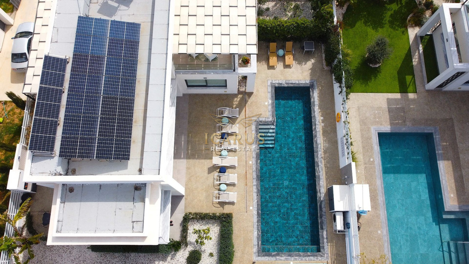 A distinct highlight is its seamless connection to a lush green area at the rear, providing a serene, private retreat. Designed with contemporary sophistication to complement the Mediterranean ambiance, this villa presents both immediate luxury and remarkable potential for further customization and growth.