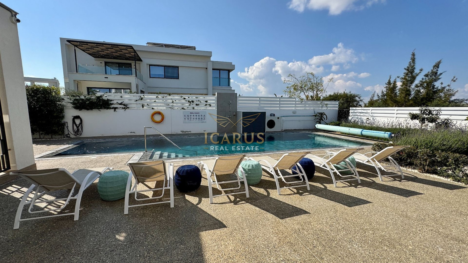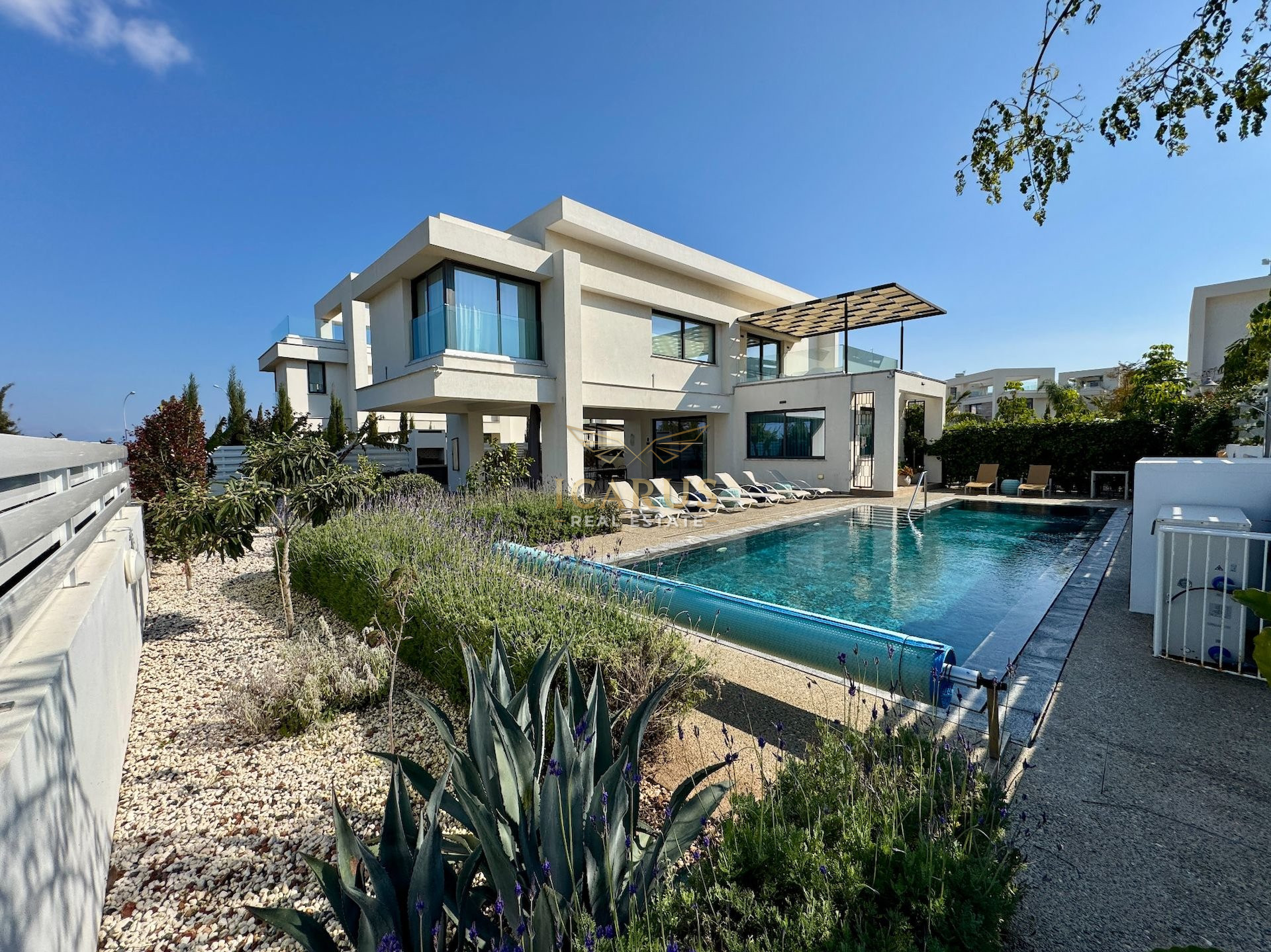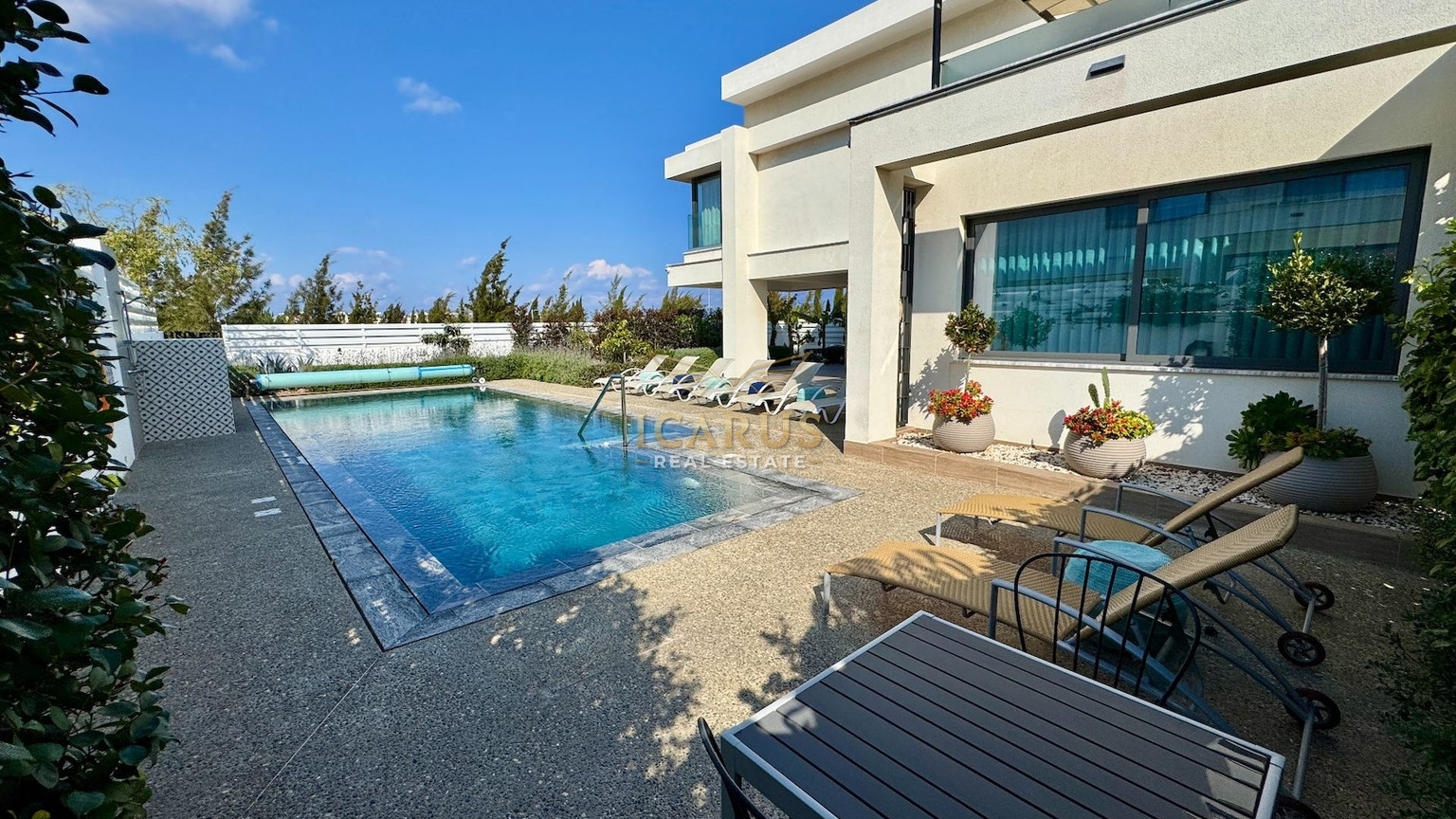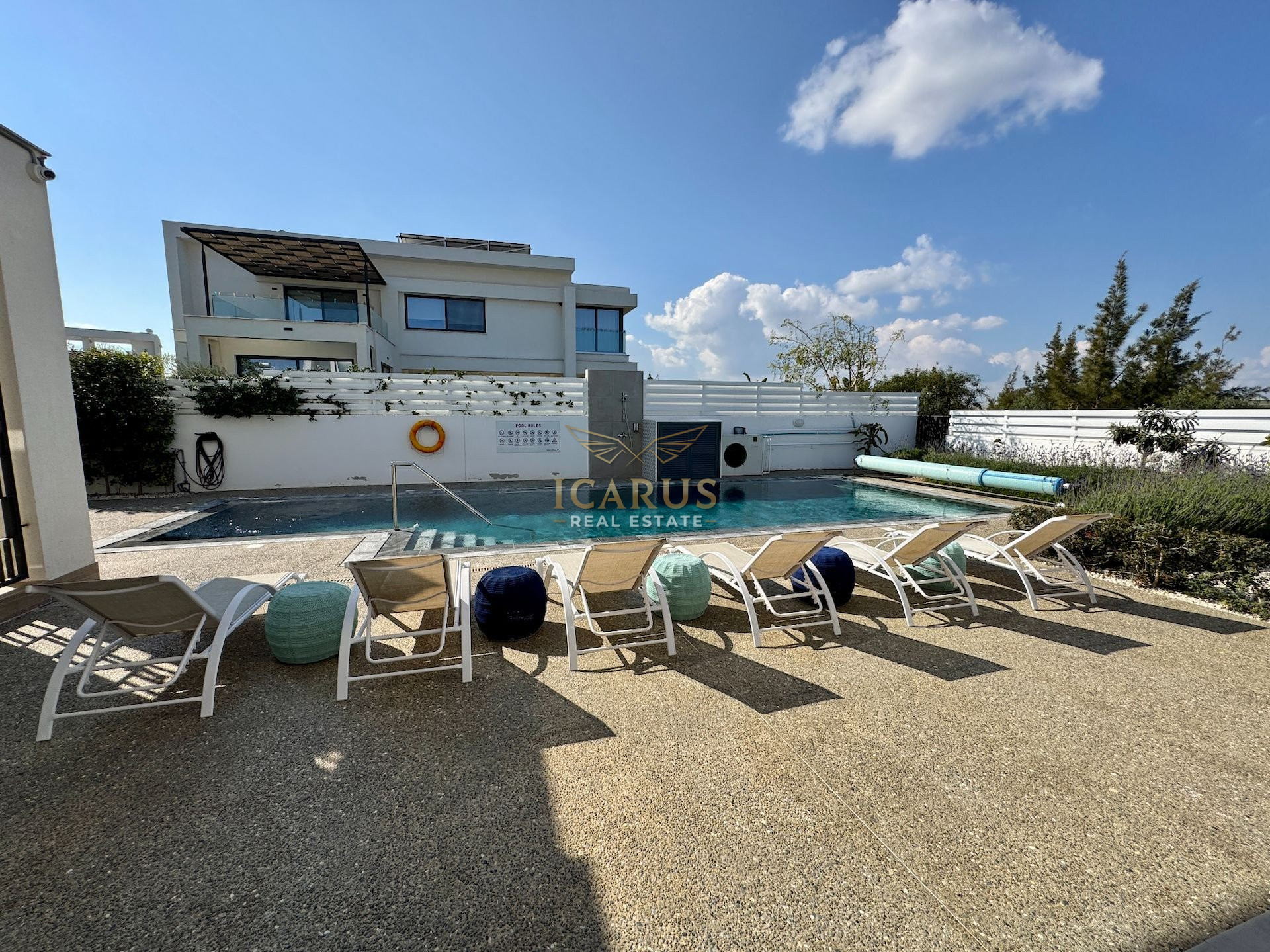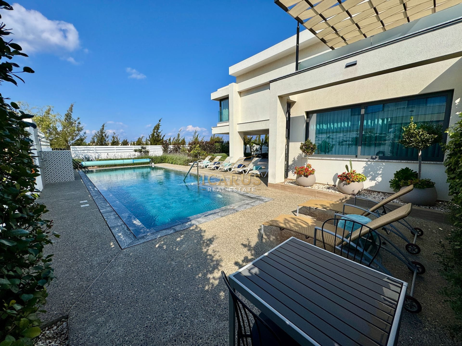 A distinct highlight is its seamless connection to a lush green area at the rear, providing a serene, private retreat. Designed with contemporary sophistication to complement the Mediterranean ambiance, this villa presents both immediate luxury and remarkable potential for further customization and growth.