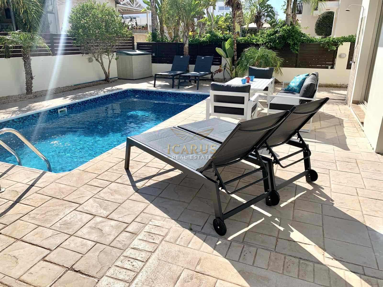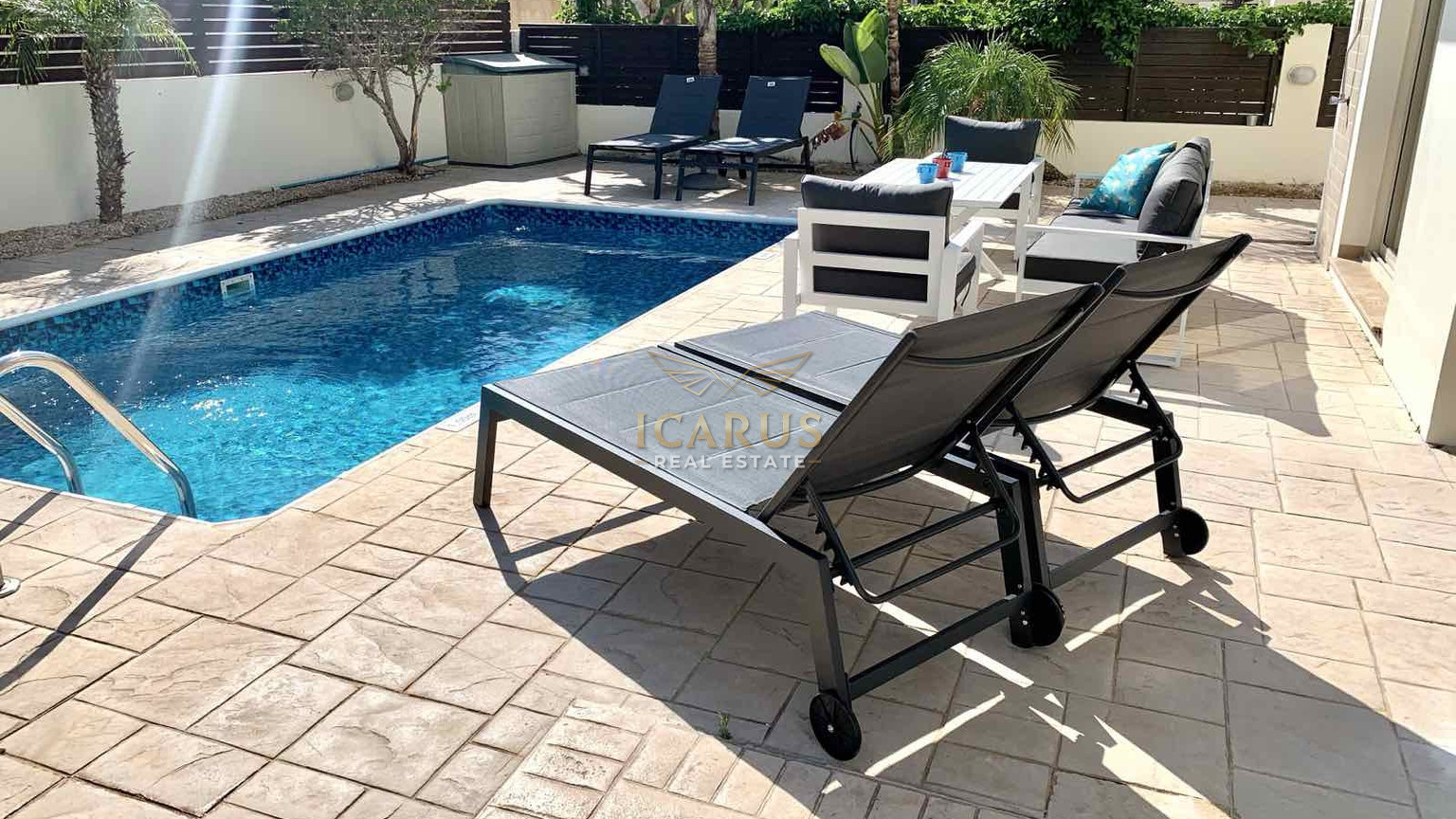 Externally, the property boasts a beautiful private swimming pool, perfect for enjoying the hot summer days, along with a sitting area, landscaped garden, and private parking space. The outdoor areas provide an ideal setting for relaxation and entertainment.