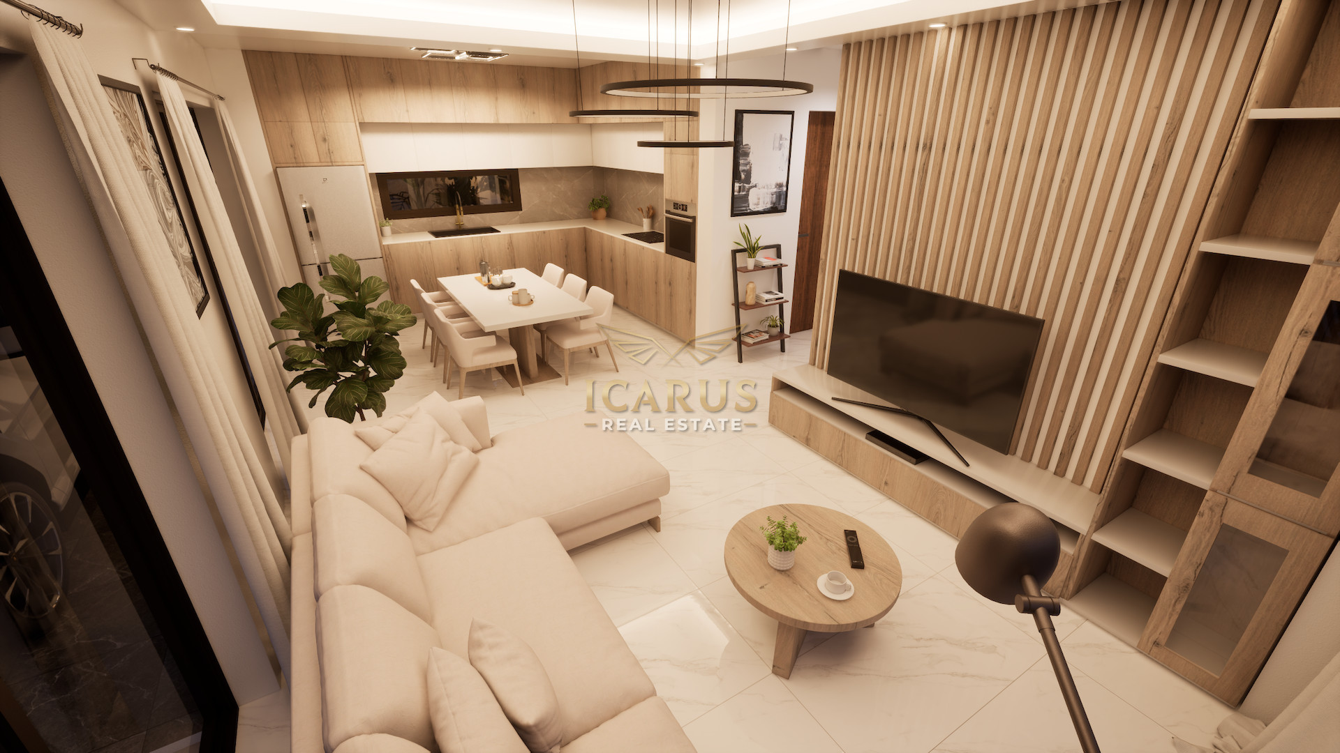 The ground floor welcomes you with a bright and spacious open-plan layout, seamlessly combining the kitchen, dining, and living areas to create a warm and inviting atmosphere. Large openings allow plenty of natural light to flow through the space. A guest WC is also conveniently located on this level.