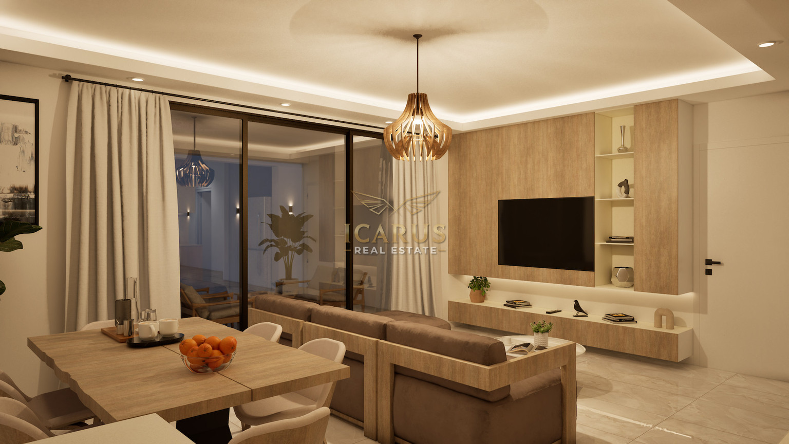 Inside, the apartment features a bright open-plan layout that brings together the living, dining, and kitchen areas, creating a practical and inviting space for everyday living. Large windows allow plenty of natural light, giving the home a fresh and airy feel.