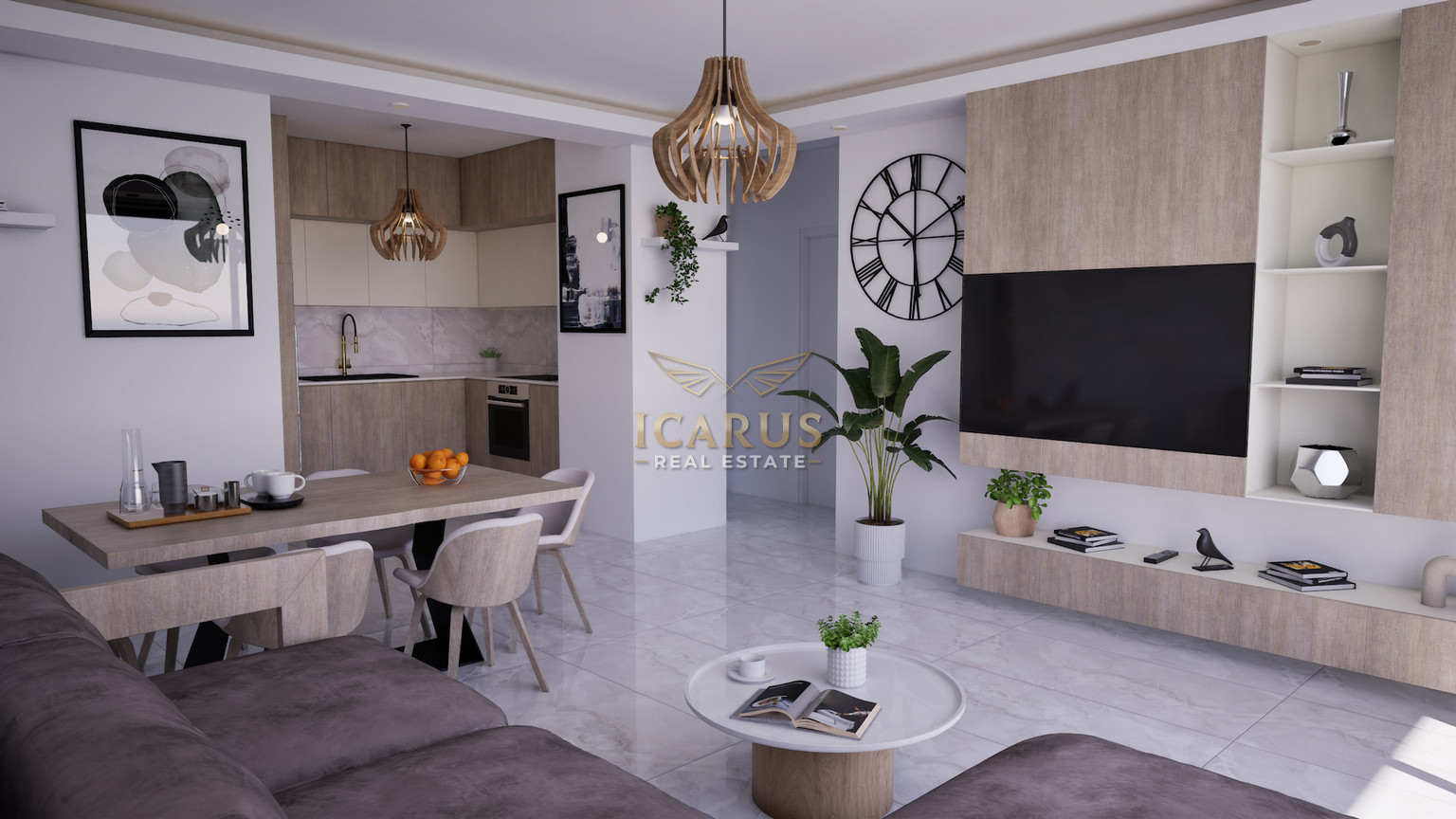Inside, the apartment features a bright open-plan layout that brings together the living, dining, and kitchen areas, creating a practical and inviting space for everyday living. Large windows allow plenty of natural light, giving the home a fresh and airy feel.