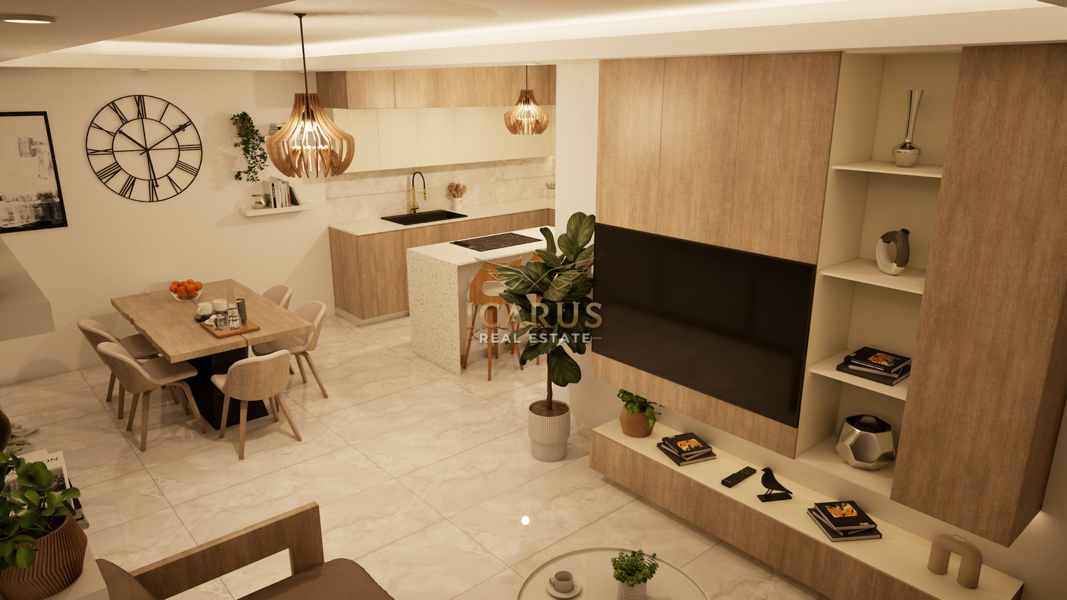 Inside, the apartment features a bright open-plan layout that brings together the living, dining, and kitchen areas, creating a practical and inviting space for everyday living. Large windows allow plenty of natural light, giving the home a fresh and airy feel.