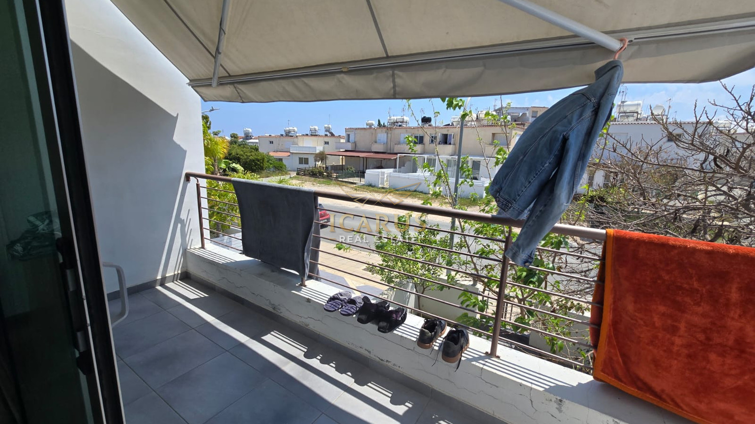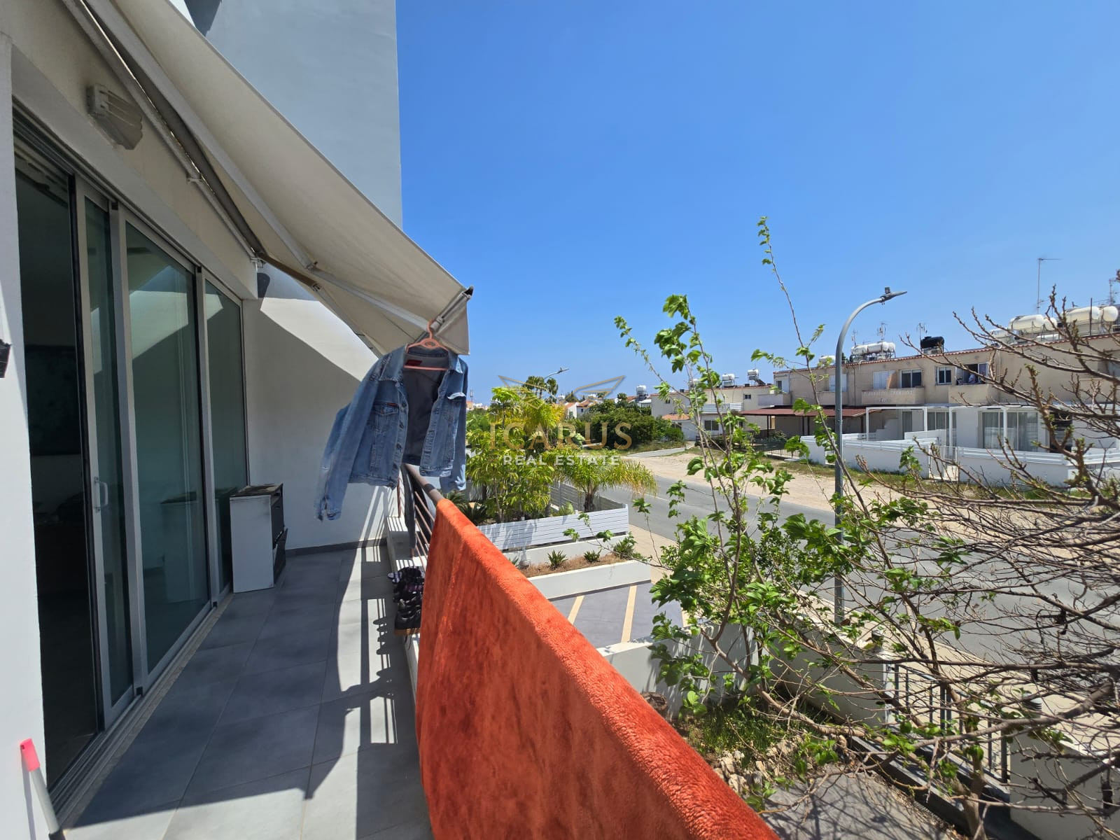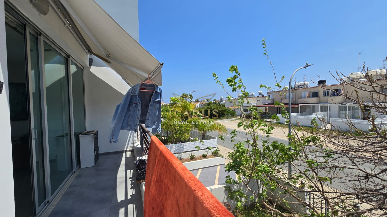 The private balcony, an inviting space to unwind and enjoy the Mediterranean atmosphere. Additional benefits include a covered parking space on the ground floor, ensuring convenience and security.