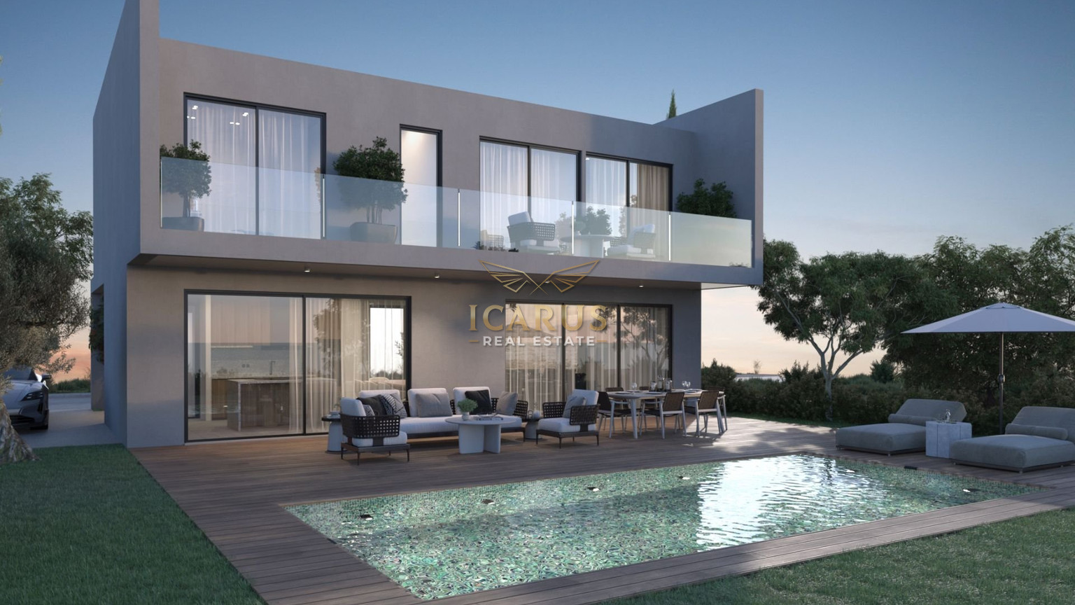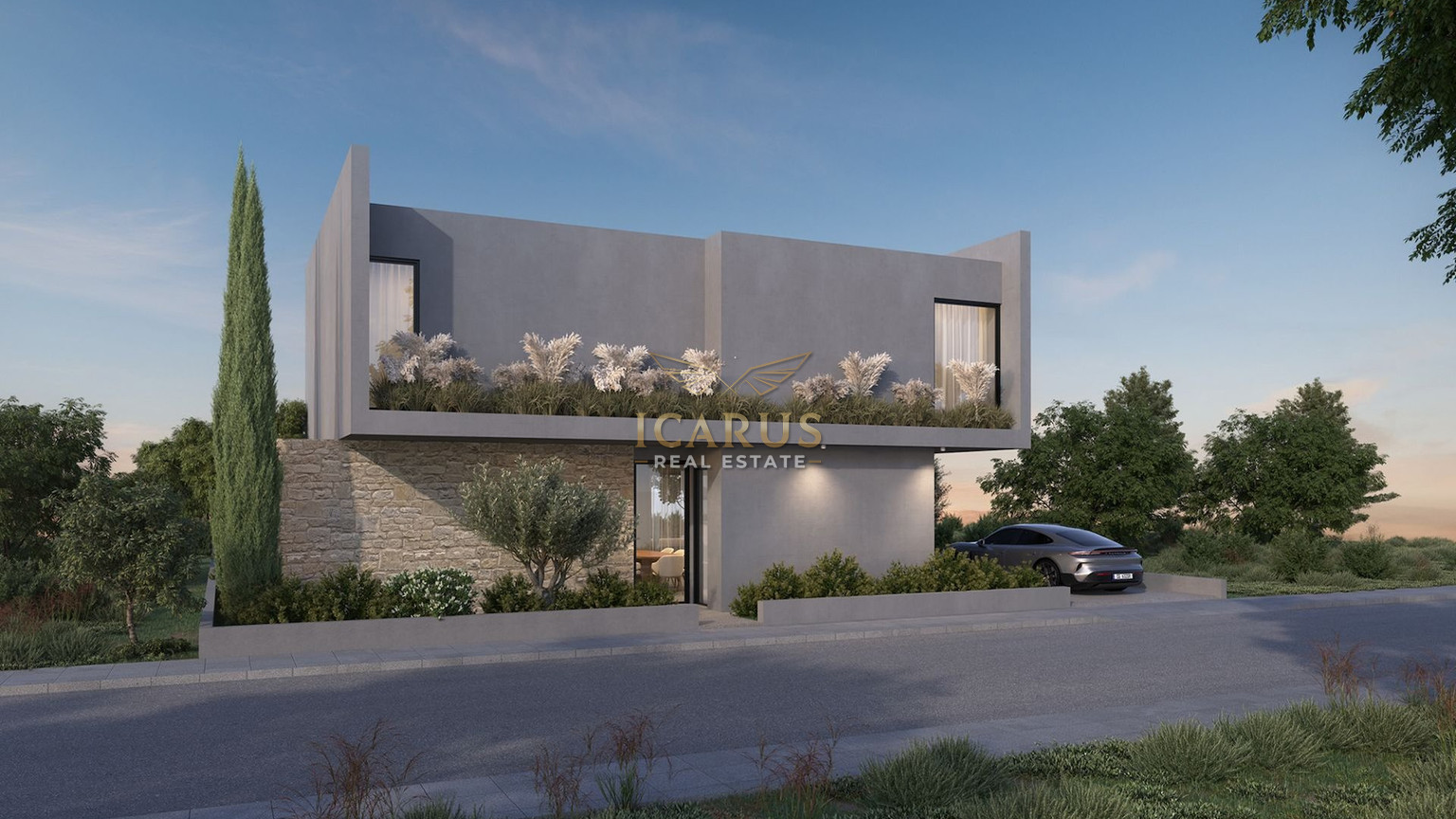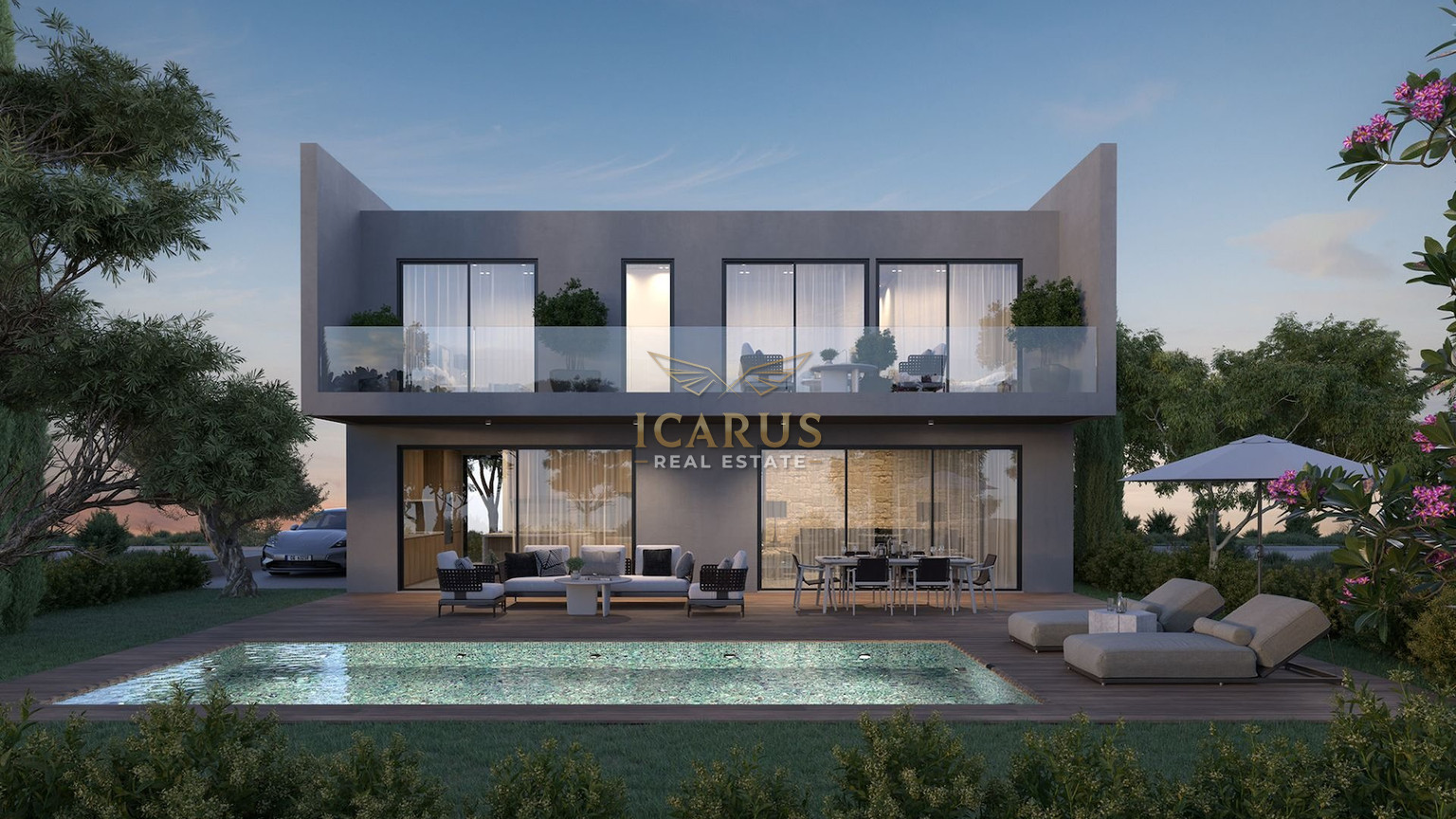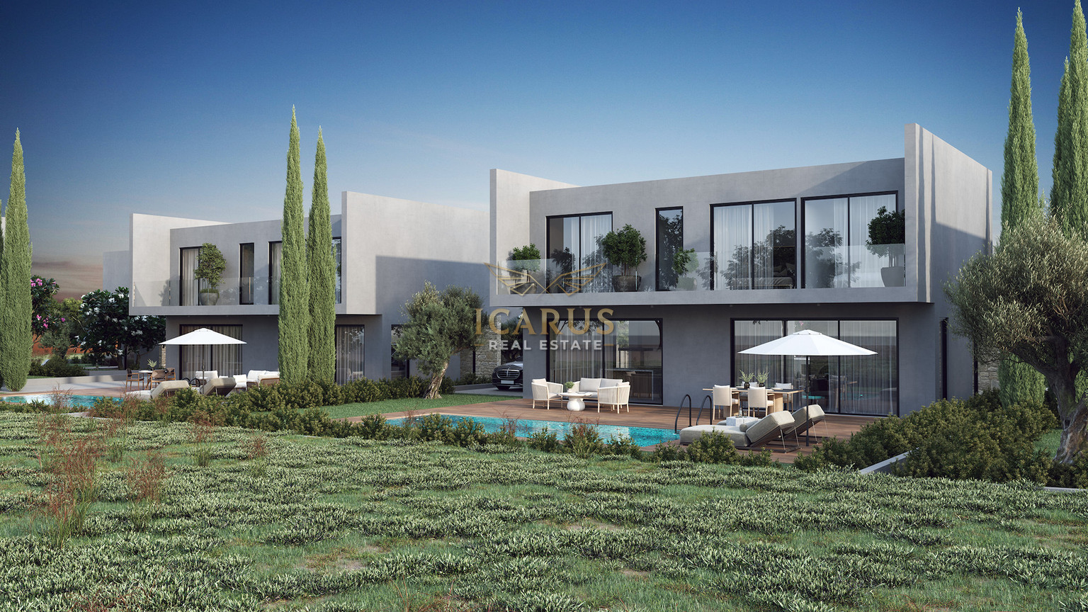Outside, a private swimming pool and a covered veranda provide a perfect spot for unwinding or hosting guests, taking full advantage of Cyprus’ sunny weather.